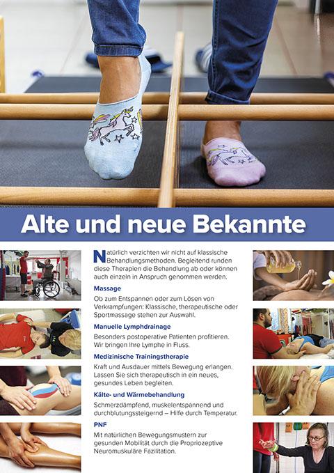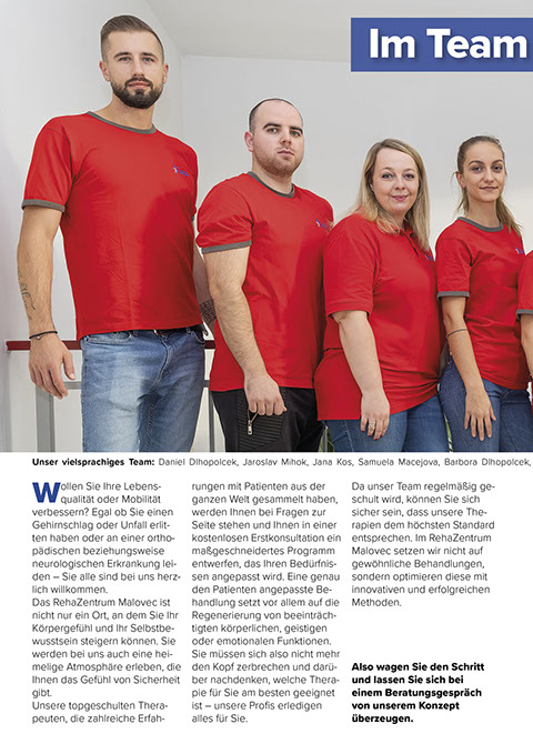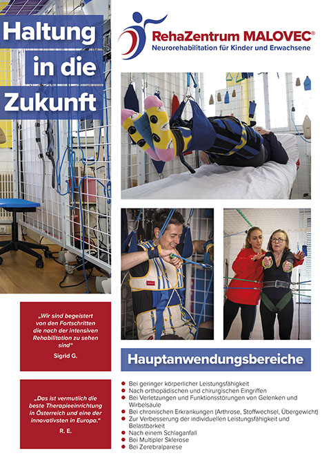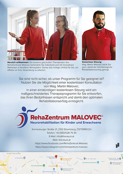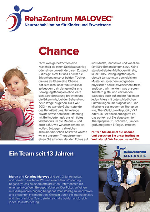 Ins RehaZentrum Malovec nach Bisamberg kommen Patienten aus vielen Ländern. Dieser A5-Flyer wurde in den Bezirksblättern Korneuburg beigelegt, um die Menschen in der unmittelbaren Umgebung auf die Möglichkeiten des Therapiezentrums aufmerksam zu machen.